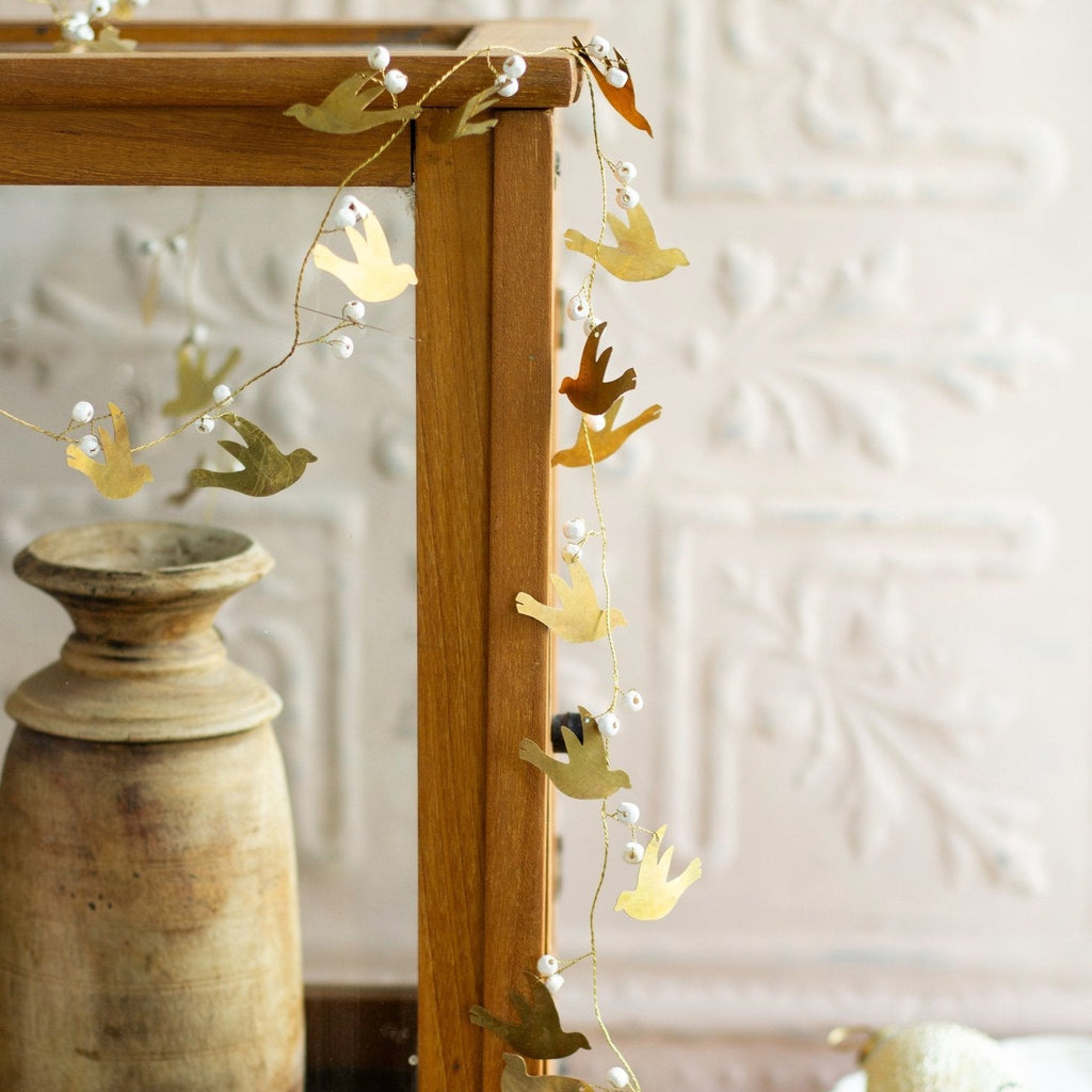 This delightful garland captures the spirit of nature with graceful brass doves suspended among clusters of ivory berries, all strung on a pliable gold wire. Wonderfully playful yet undeniably elegant, it's designed to bend and curve wherever inspiration strikes - weave it around the stair banister, loop it around doorways, or let it cascade across mantels and shelves. Whether you're creating festive magic or adding a touch of whimsy to everyday décor, this artisanal piece brings lightness and joy to your space, season after season.