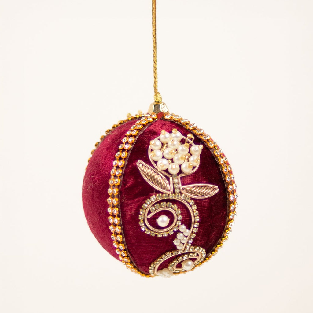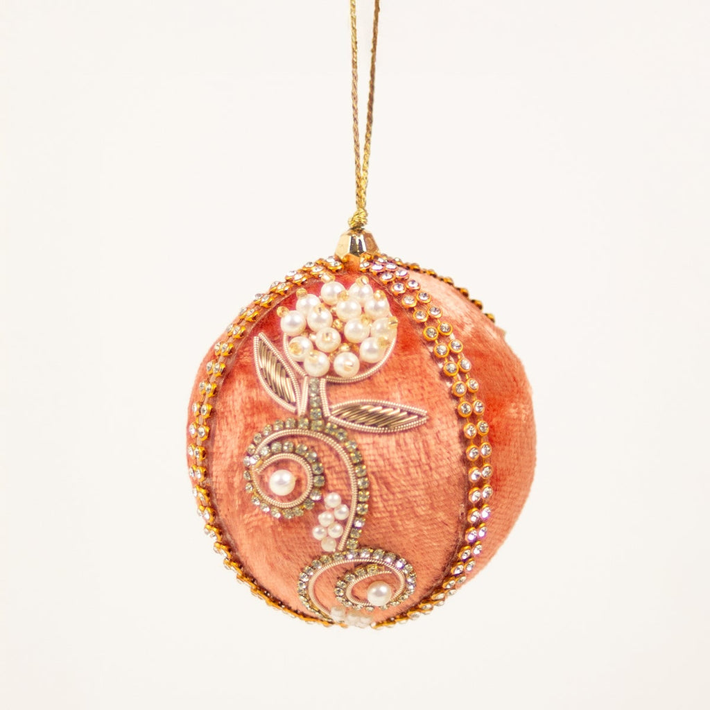 Bring a touch of old-world glamour to your tree with this enchanting handmade ornament. Inspired by Venetian craftsmanship, each bauble is lovingly embellished with gleaming brass beads, sparkling jewels, and lustrous pearls that dance in the light. In a rich peach tone, this will be the ornament that transforms your festive display from ordinary to absolutely magical – the kind of decoration that becomes a conversation starter year after year.