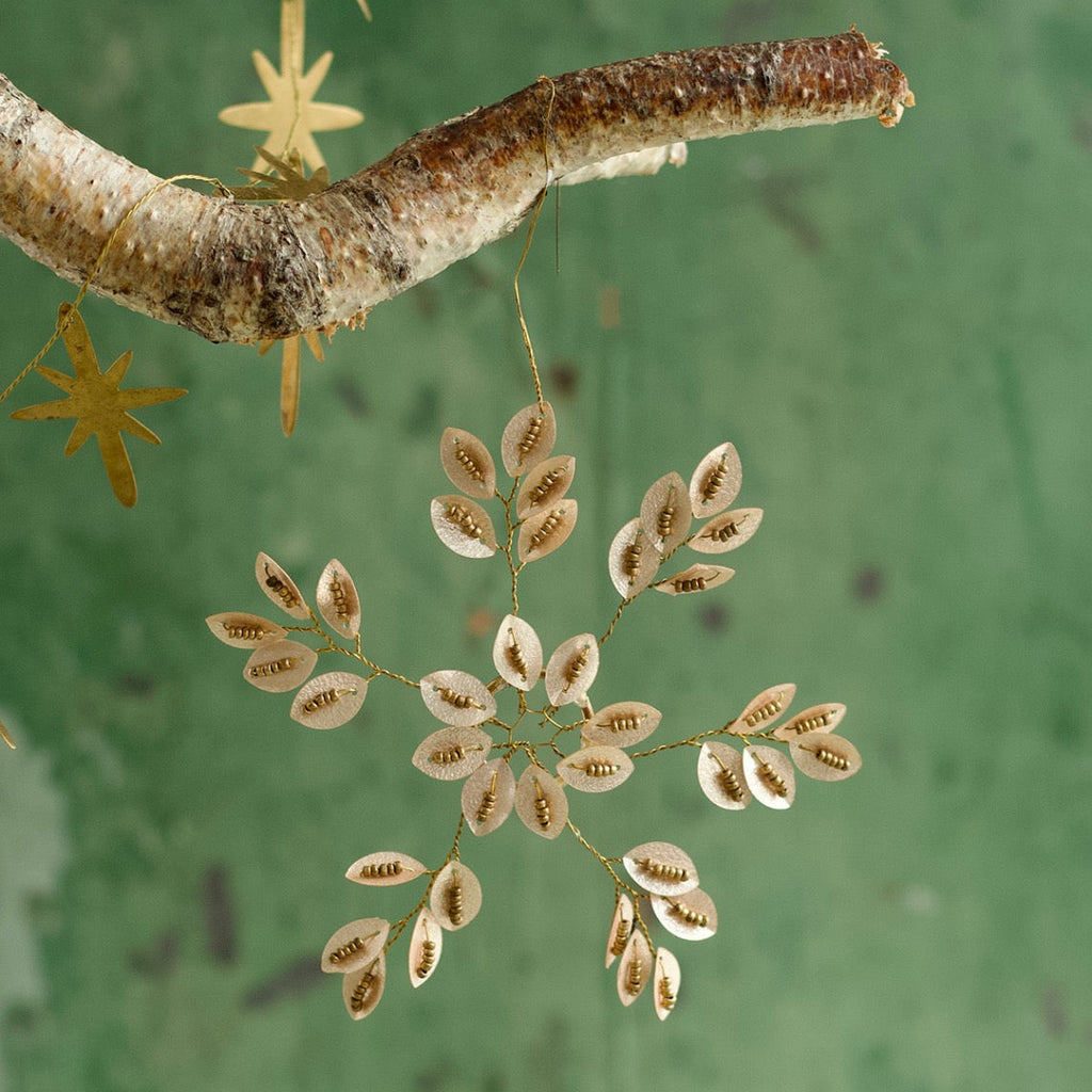 Handmade hanging star decoration of soft gold-coloured, slightly pearlescent, sequins. Inspired by traditional paillettes - disc-shaped embellishments used in garments - this piece brings shimmer and elegance to any space.