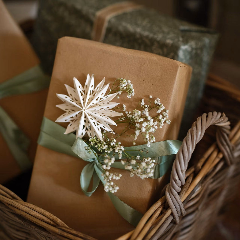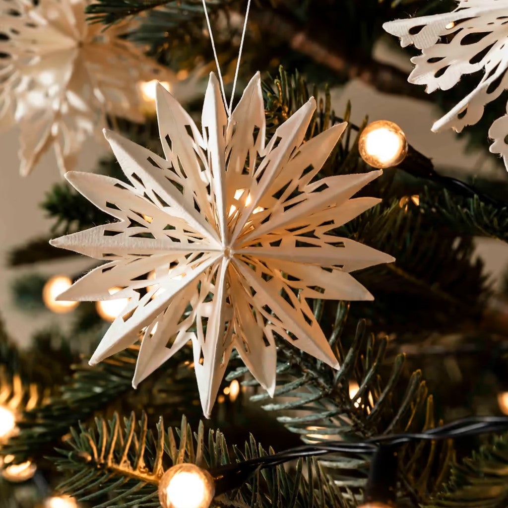 Bring a cosy winter vibe to your space with this charming set of nine small cotton paper cutout stars in warm white. Their intricate cutout design casts lovely patterns of light, creating a twinkling effect like a starry night sky. Perfect for hanging in clusters in the window, on Christmas trees, or anywhere around your home to boost the festive spirit - they even make gifts extra special when used as decoration. For a modern twist, mix and match them with other paper decorations from this collection (see here).