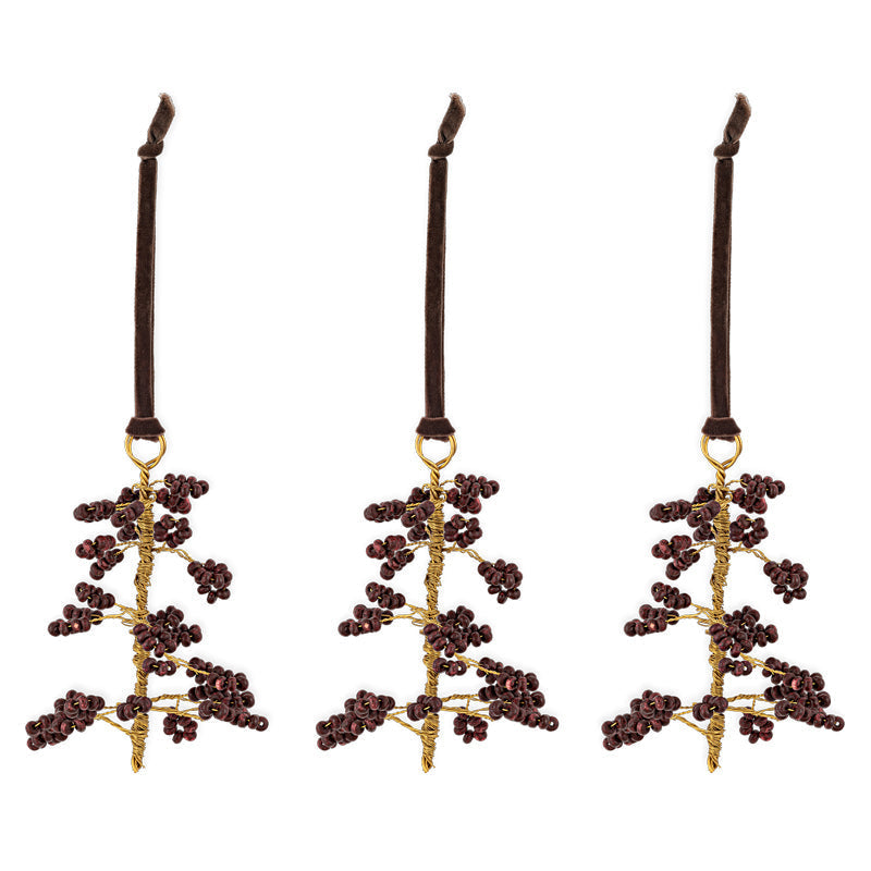 Wooden Beaded Tree Hanging Decorations - Brass and Ruby Red - Set of Three