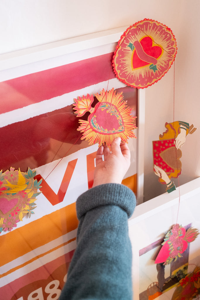 Drawing from Mexican folk traditions and sacred heart symbolism, this whimsical three-metre garland strings together ten ornate, jewelled hearts brimming with nostalgic charm and romantic flair. Perfect for adding a touch of colourful kitsch to any space.