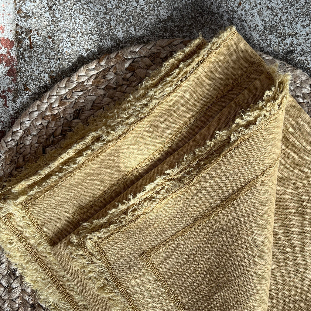 Bring festive flair to your dining with these charming square linen napkins. Crafted from pure linen with an artfully frayed edge, they're the ideal companion for holiday gatherings and everyday elegance alike. A set of four in a sophisticated old gold hue that adds warmth to any table setting.