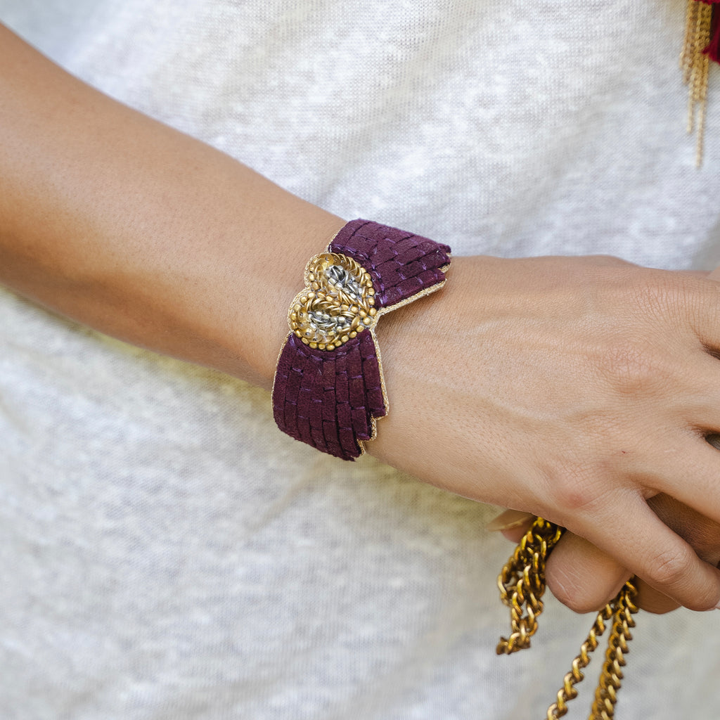 Leather handmade bangle in the shape of angel wings. Adorned with sequins and brass beads, with soft leather lining.