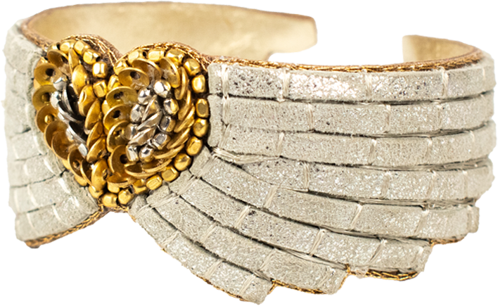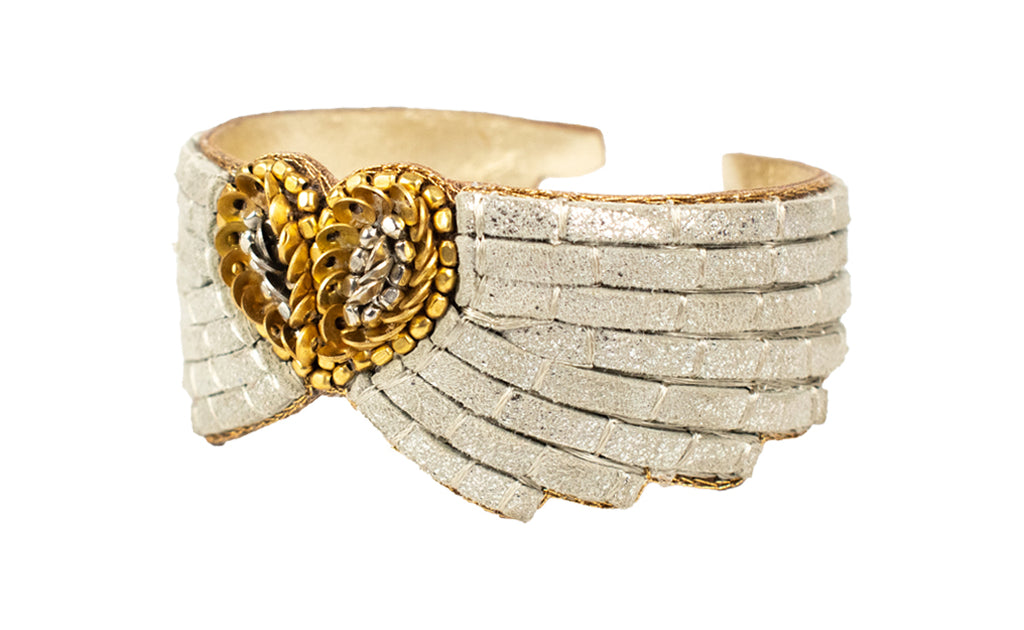 Leather handmade bangle in the shape of angel wings. Adorned with sequins and brass beads, with soft leather lining.