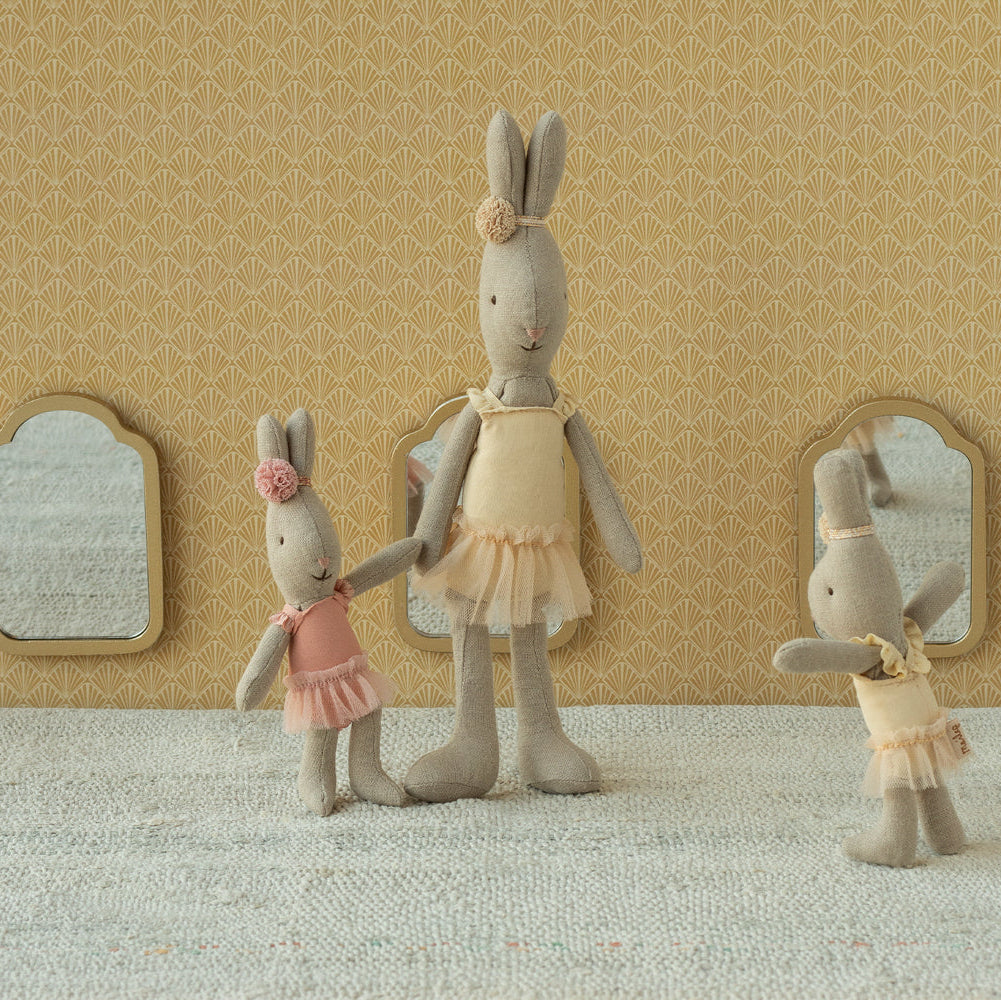 The well known Maileg micro bunny dressed up as a ballet dancer. It wears a suit and tulle skirt and has a small decoration around the pointing ears.