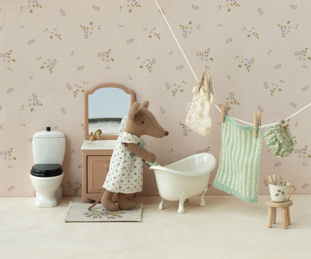 A must-have for any mouse household bathroom! This tiny dresser includes a sink and a mini closet, not to mention a mirror. Don't forget to complete the scene with Maileg's toilet and bathtub!