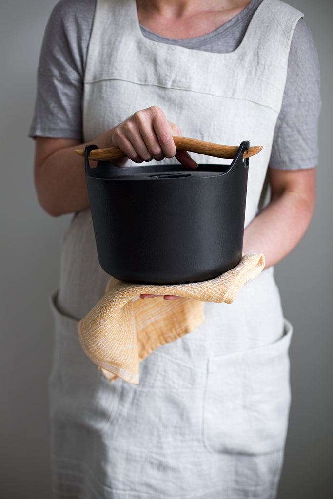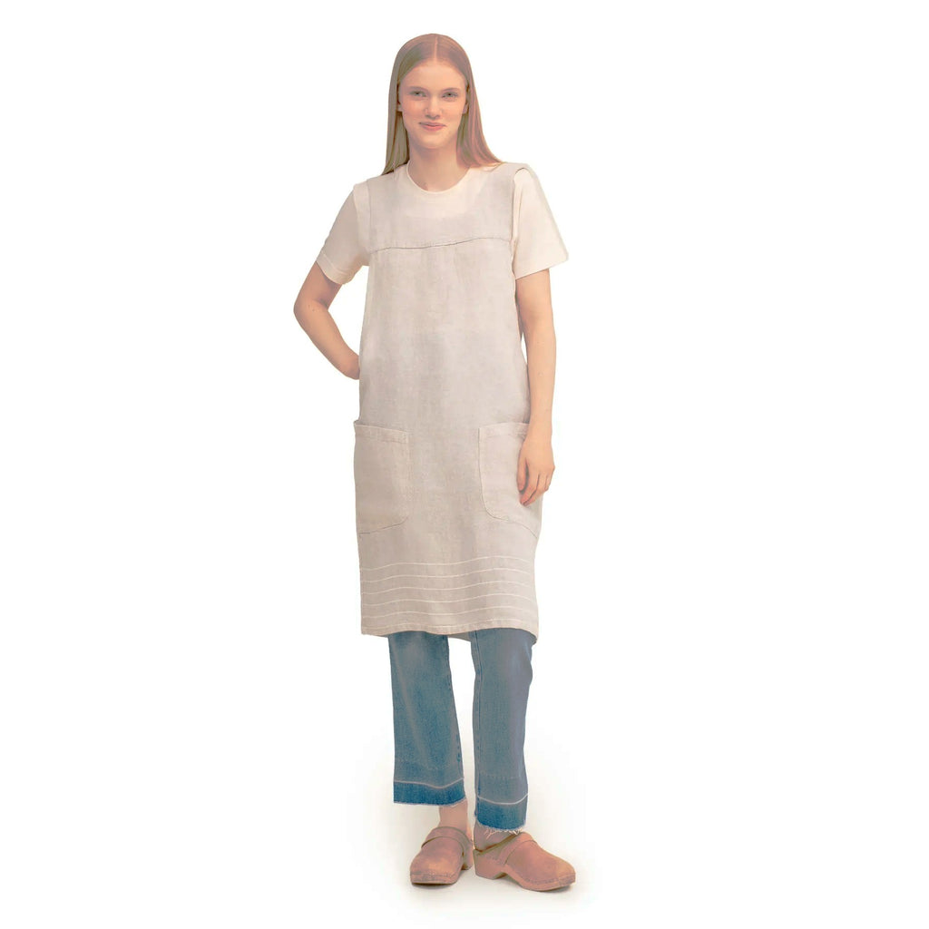 Crafted from pure washed linen by Finland's renowned Lapuan Kankurit, this cross-back apron combines effortless style with everyday practicality. The innovative crossback design eliminates fussy ties - simply slip it over your head and you're ready to cook, craft, or create. Its generous front pockets keep your essentials within reach, while the durable 100% linen construction shields you from kitchen spills and splatters with understated elegance. Whether you're preparing a weeknight meal or hosting an impressive dinner, this versatile apron fits most people and transforms a functional necessity into a statement piece that celebrates artisanal craftsmanship.