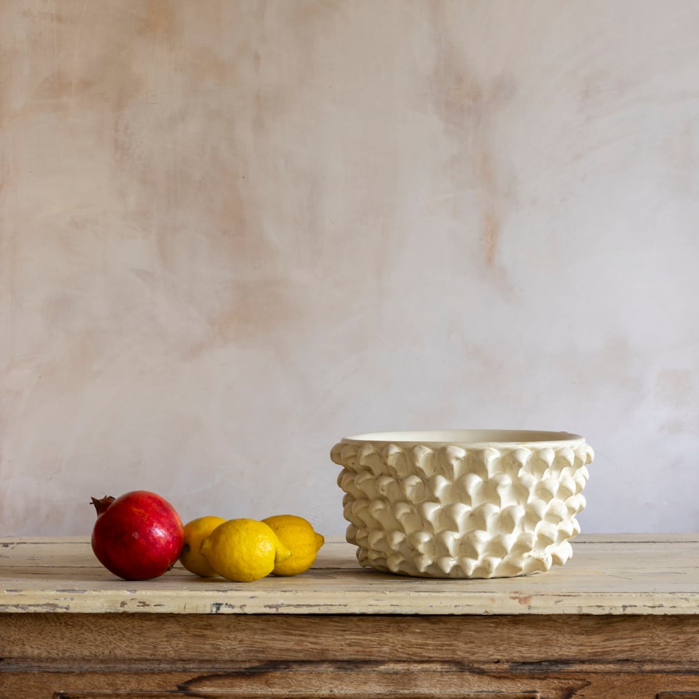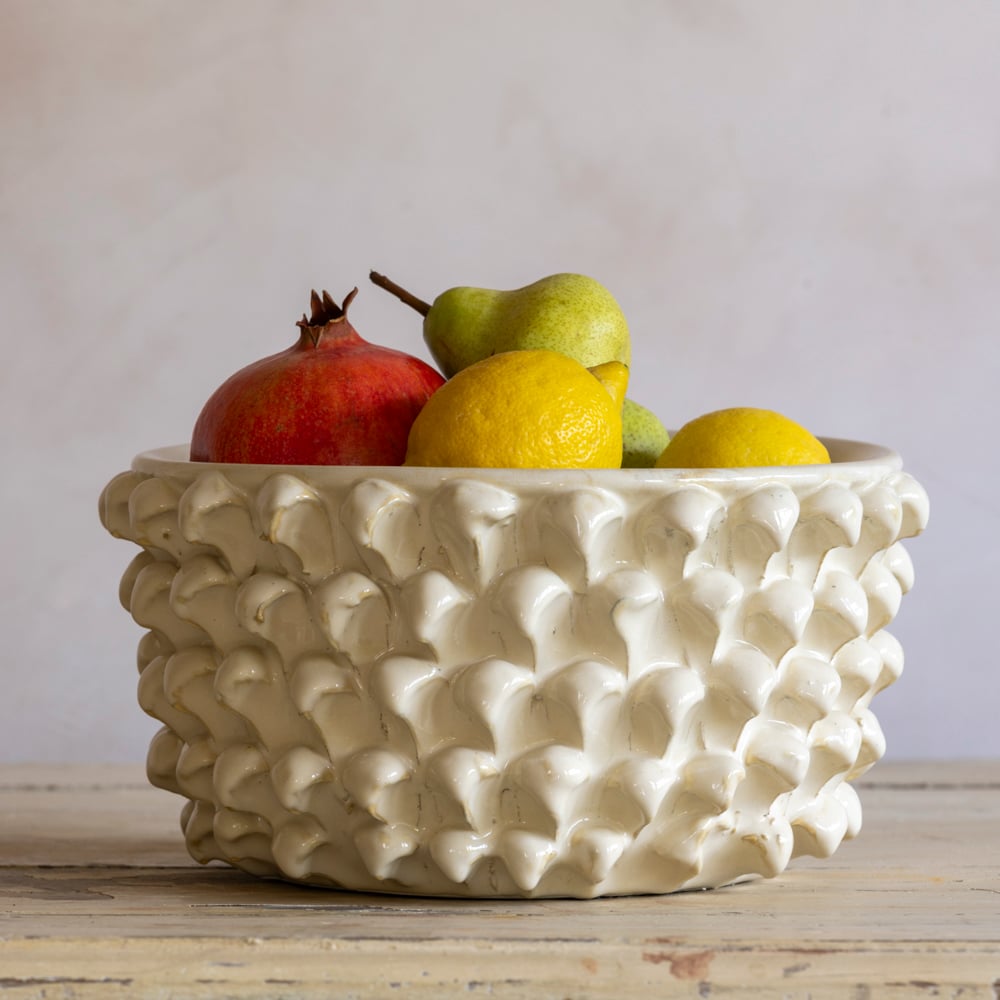 Discover the cream-coloured Porticello Bowl, a beautifully glazed piece combining versatility with style.  Its unique, bobble-inspired shape is carefully handcrafted, making it ideal for displaying fresh fruit, flowers, or delicious desserts.  This bowl offers endless uses, doubling as both a practical item and a striking decorative feature sure to impress any guest.