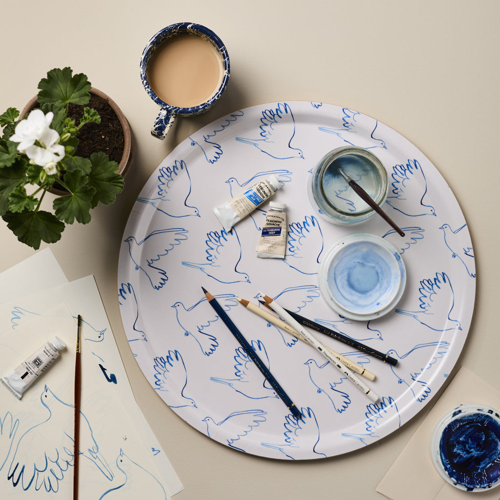 Featuring striking minimal cream and blue dove design from Wanderlust Paper Co. this is a versatile piece that elevates any space. Use it to corral bathroom essentials or serve refreshments with understated elegance.
