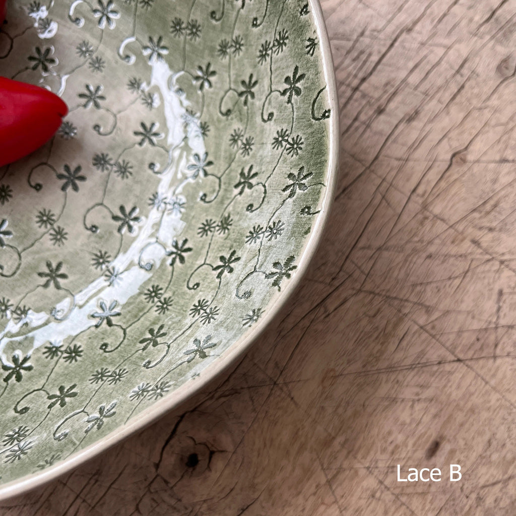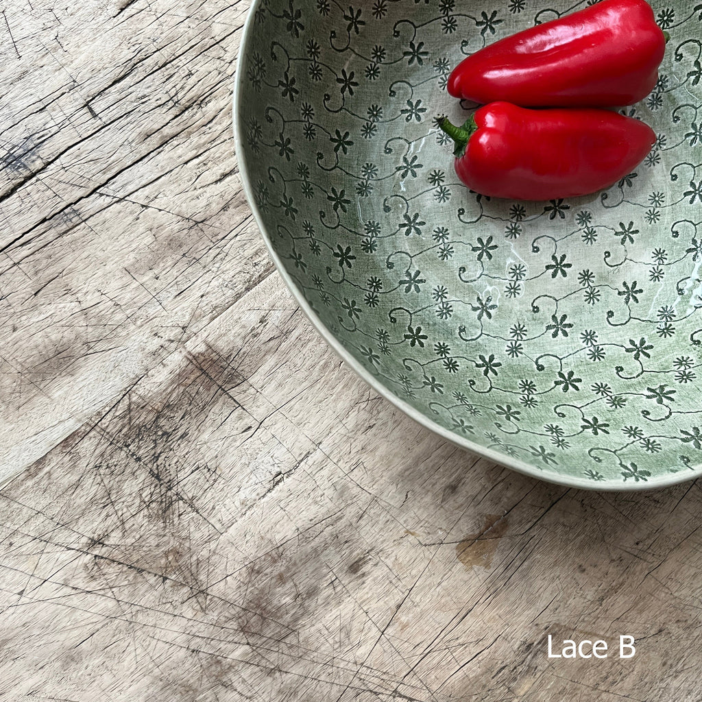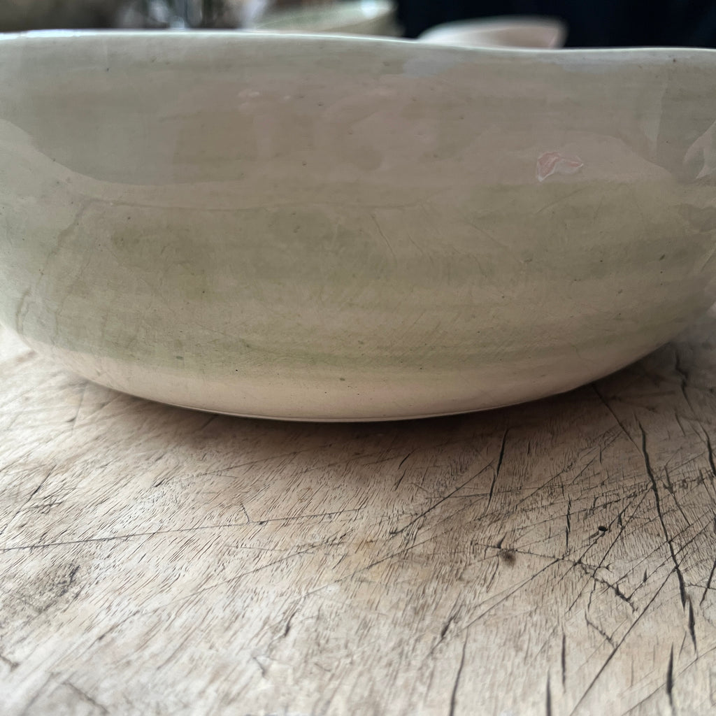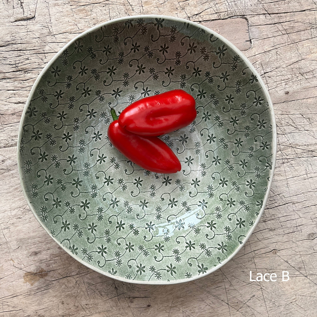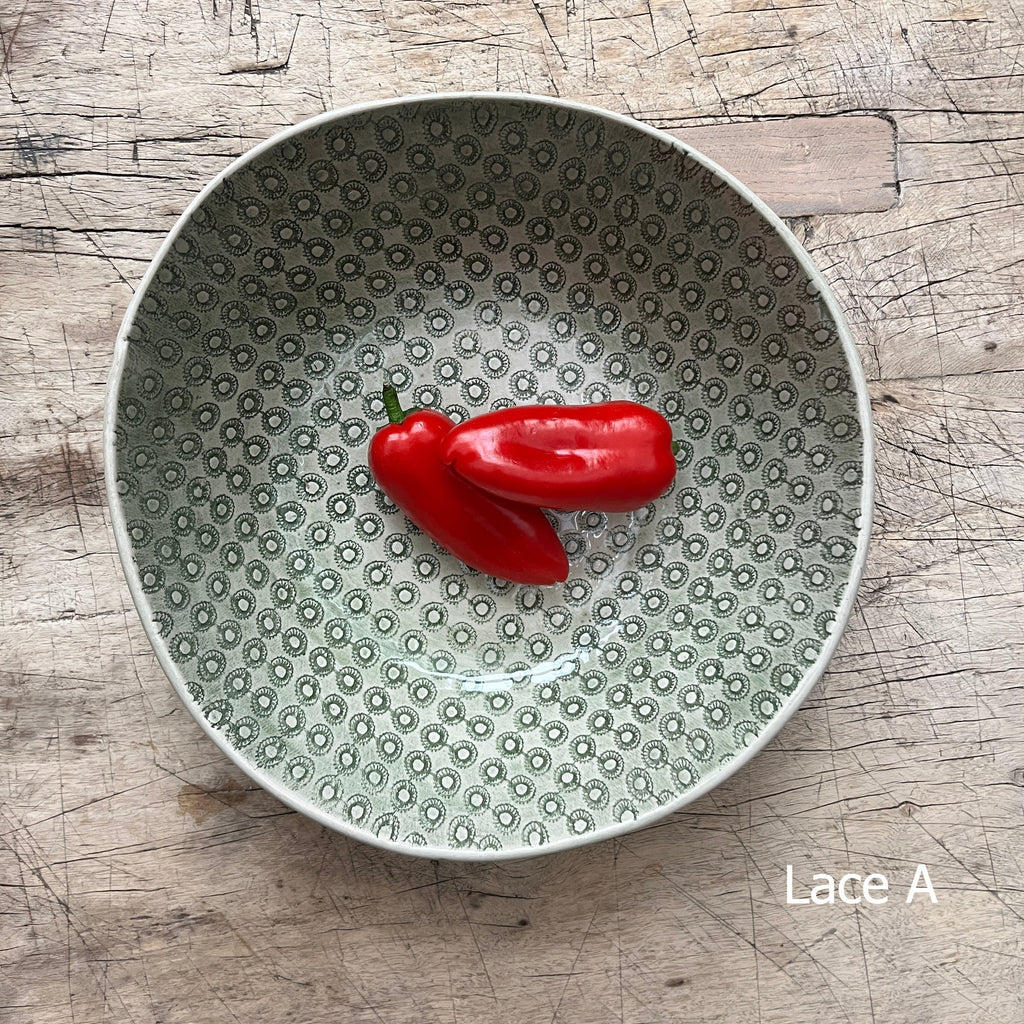 A beautiful, mid-size, round serving bowl, approximately 23cm diameter.  Shallower than a conventional bowl but flatter and with straight sides rather than sloped, with a larger surface area, so ideal for showing off all the lovely bits in a salad or pasta dish.