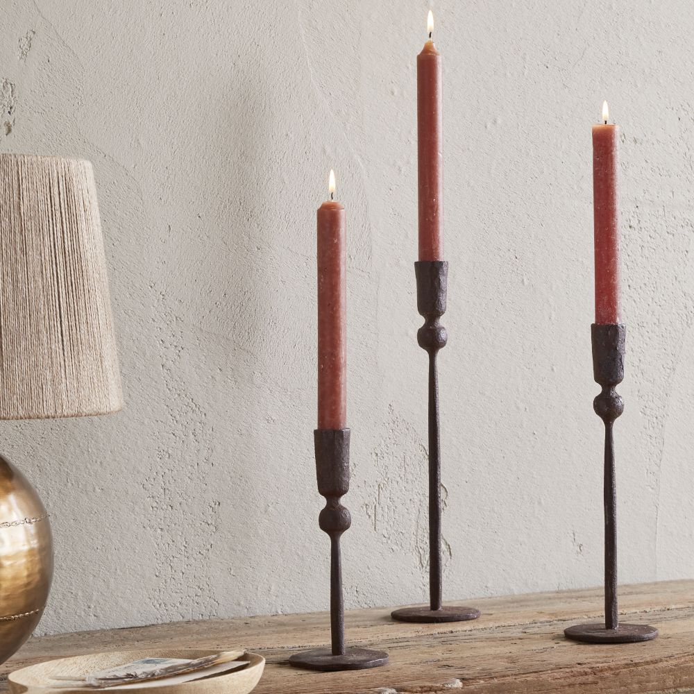 These iron candlesticks, finished in a warm rust tone, introduce a subtle earthy charm to your decor. Their hammered texture and sleek, natural silhouette offer rustic sophistication, perfect for enhancing any table arrangement. Offered in three sizes, they make a bold statement when paired or grouped in threes. Adaptable and inviting, they suit both indoor and outdoor settings beautifully.