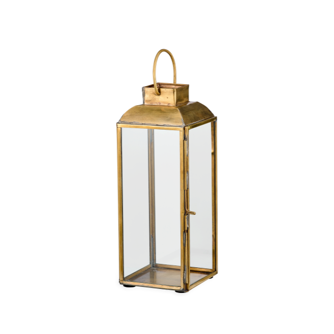 Made from brass and featuring four clear glass panels elegantly set within brass frames, this lantern combines classic design with functionality. It includes a solid brass base and a straightforward carry handle. The glass door, secured by a simple pin, opens easily to hold a tea light inside. Its tall yet compact size makes it ideal for showcasing on a mantelpiece.