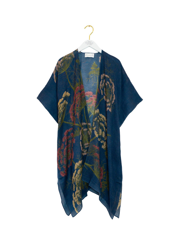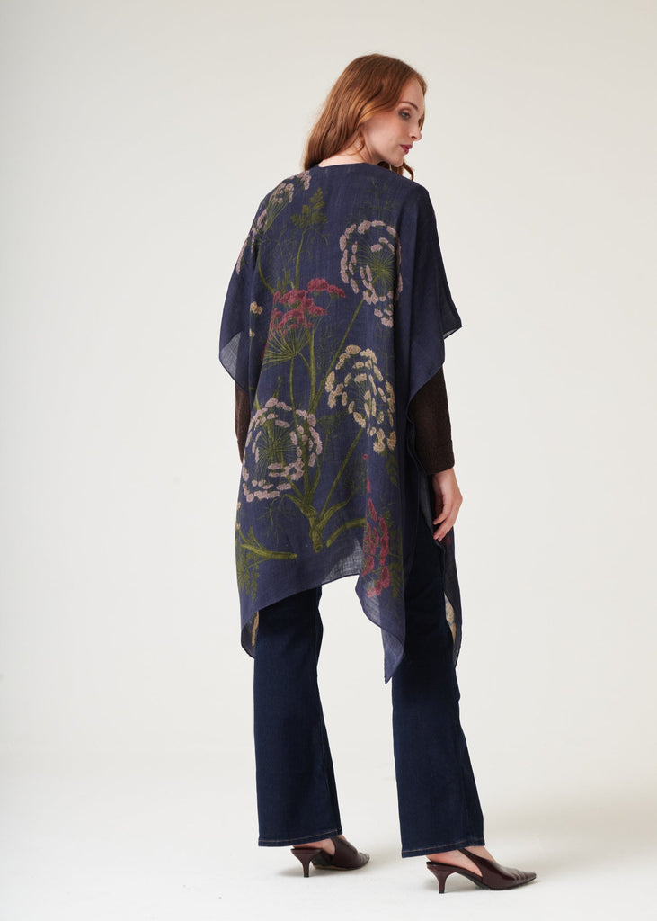 Drawing inspiration from a towering cow parsley plant ready to release its seeds, this throwover features delicate pink, rust, and camel floral accents against a deep midnight blue background.