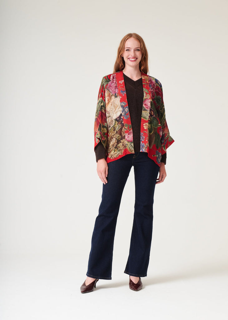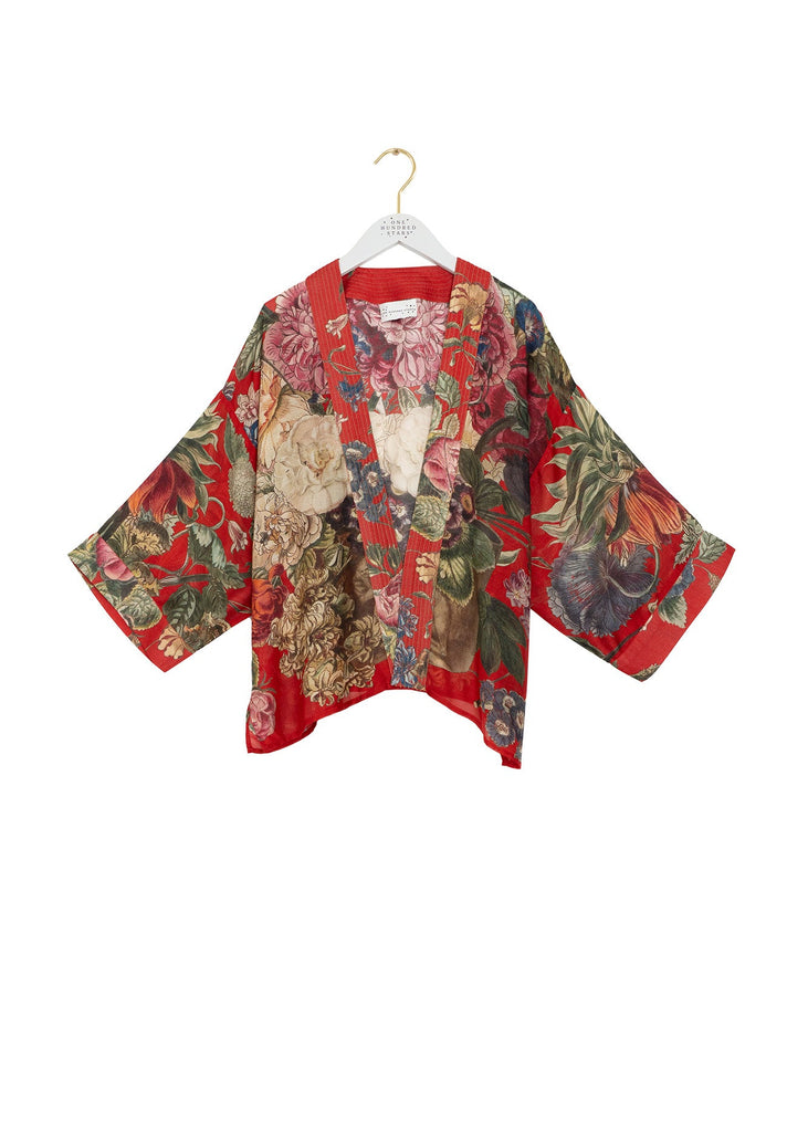 Drawing inspiration from the Dutch Old Masters, this kimono features a vibrant bouquet of primroses, auriculas, and polyanthus flowers in striking, vivid hues. The intricate detailing of this print is truly spectacular!
