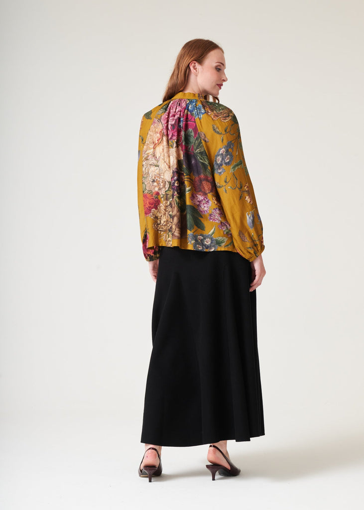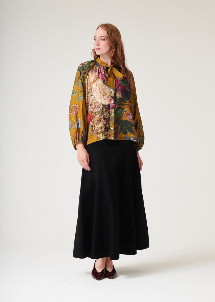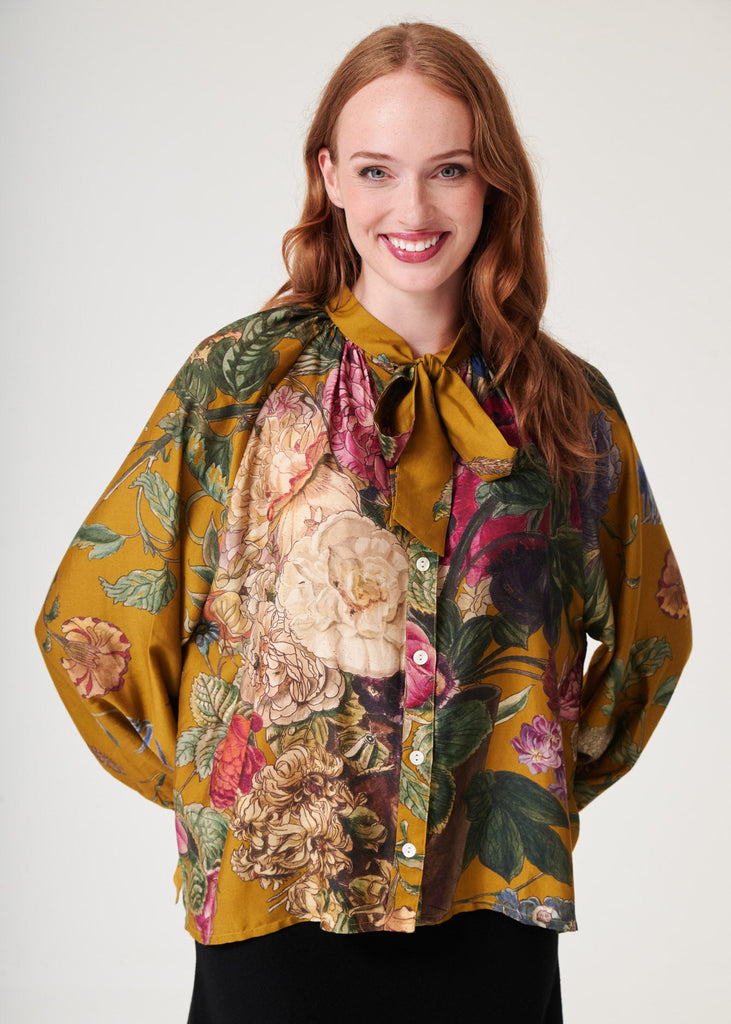 Drawing inspiration from the Dutch Old Masters, this blouse features a vibrant bouquet of primroses, auriculas, and polyanthus flowers in striking, vivid hues. The intricate detailing of this print is truly spectacular!
