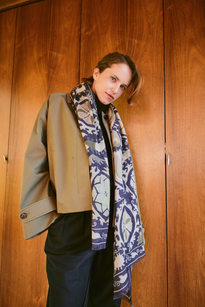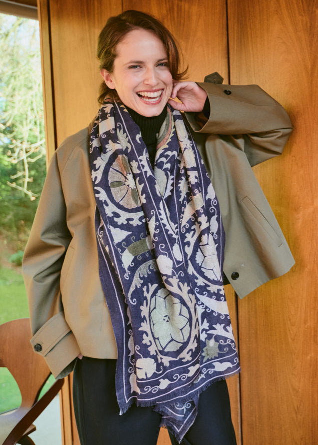 Featuring a striking oversized pattern inspired by traditional Susani needlework, this scarf showcases East Asian artistry. The printed taupe and khaki chainstitch detailing stands out beautifully against a smooth charcoal background, creating a refined yet bold aesthetic.