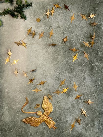 Meet your new favourite decorative companion - the Brass Northern Stars Garland! This charming handcrafted beauty strings together gleaming brass stars on delicate wire, creating a whimsical display that catches the light and steals the show. Whether you're dressing the space for a special occasion, hosting an intimate gathering, or simply wanting to sprinkle a bit of sparkle into your everyday routine, this lightweight wonder works magic on walls, tables, mirrors, and beyond. It's the kind of piece that makes people smile the moment they spot it.