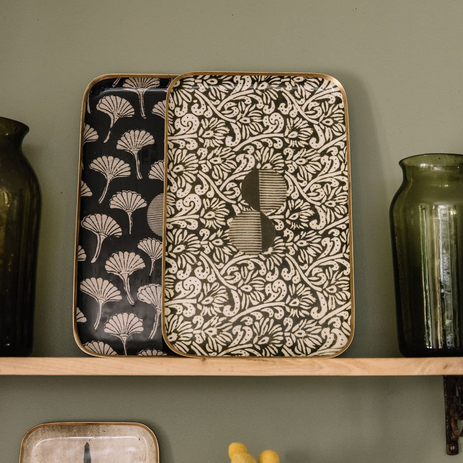 Enamelled aluminium tray with hand-gilded border finish.  The image is of beautiful ginkgo leaves on a carbon coloured background.