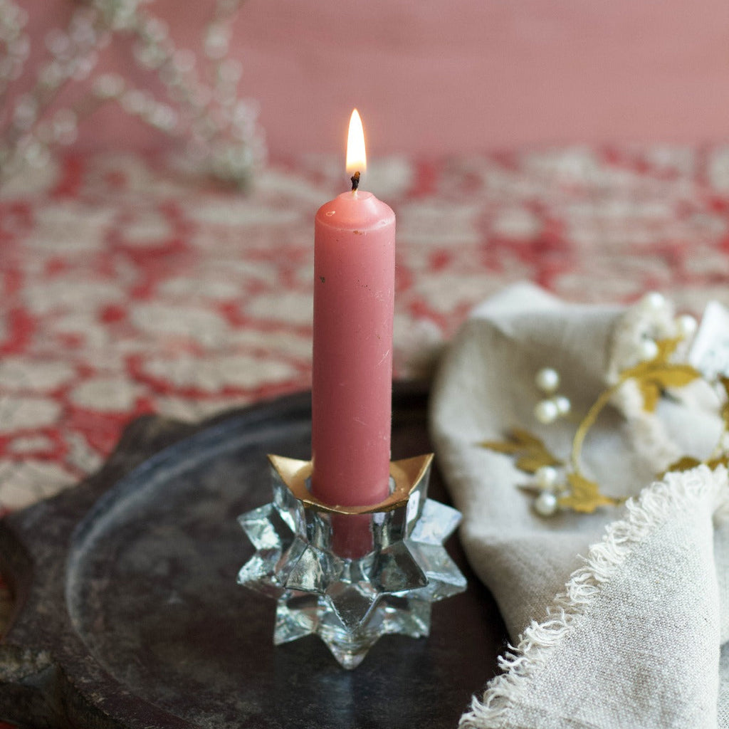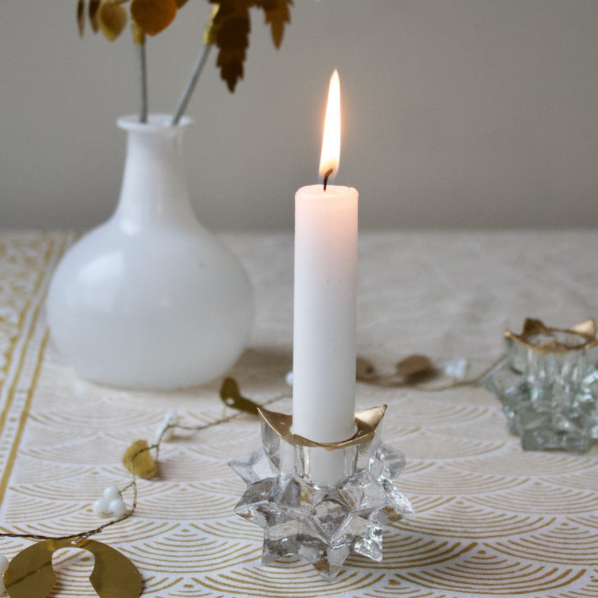 Perfect for adorning a dinner party tablescape, this beautiful Star Glass Candleholder, complete with its gold trim, will beautifully illuminate your interior when paired with a lit candle. Takes a regular diameter dinner candle (2.1-2.3cm dia) but works really well with short or mini dinner candles.