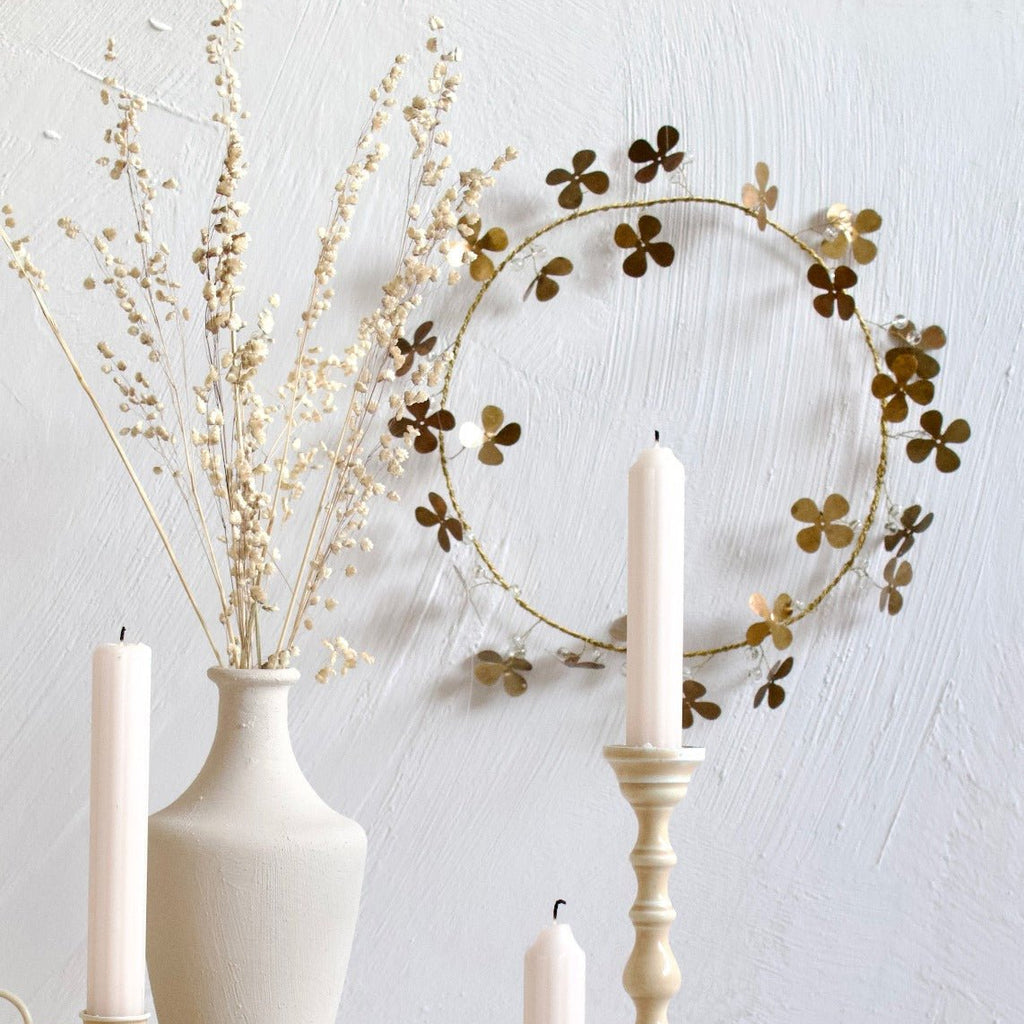 Say hello to instant charm with this delightful brass wreath, where lucky four-leaf clovers dance alongside sparkling glass berries. Brimming with symbolism, each clover celebrates unity, trust, love, and happiness in the most stylish way possible. A playful nod to good fortune that transforms any wall into a conversation starter.